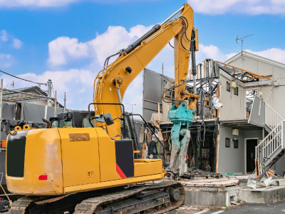 総合解体業とは、建物や家屋などの構造物を取り壊し撤去する工事です。騒音や粉じんを防ぐための養生から、内装材などの分別撤去、重機を使った本体解体、廃棄物の分別と適正処理、最後に土地を平らにならす整地までを一貫して行います。